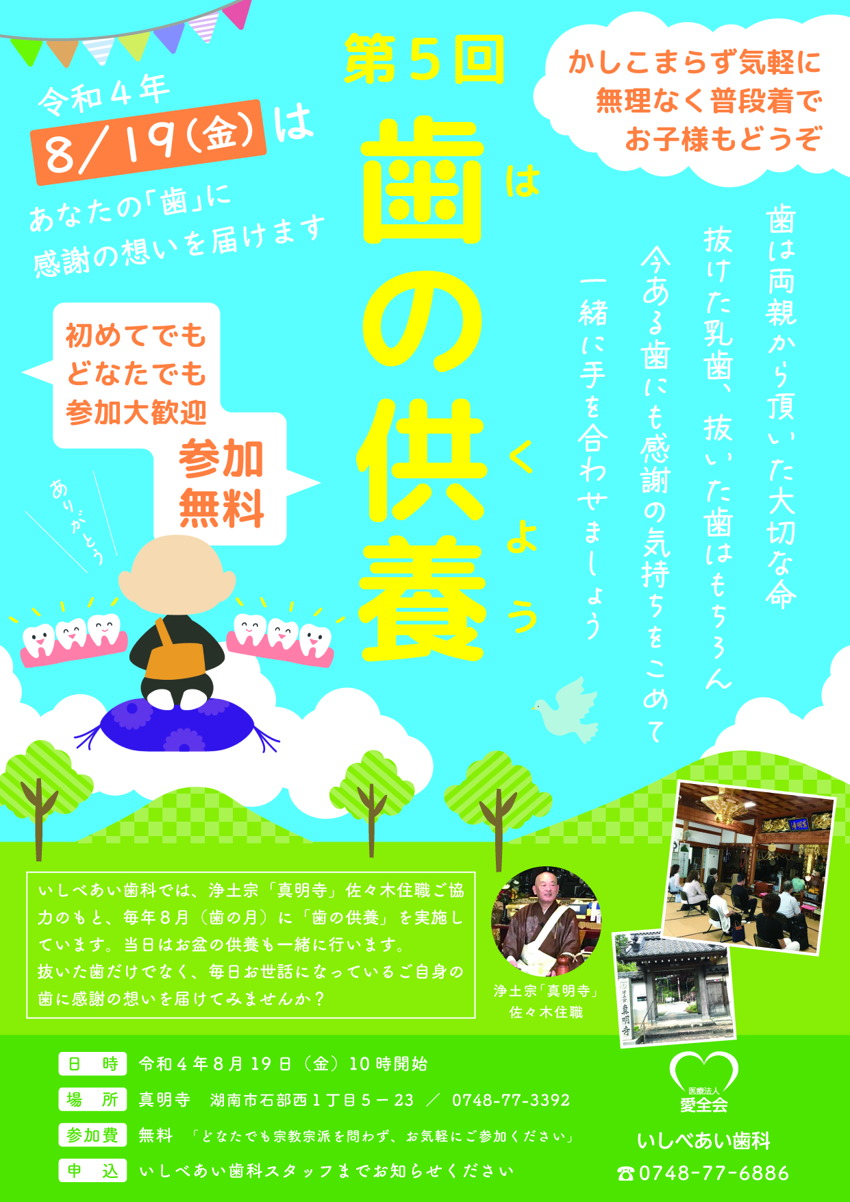 第5回 歯の供養開催のお知らせ ■日 時:令和4年8月19日(金)10時開始 ■場 所:真明寺 湖南市石部西1丁目5ー23 / 0748-77-3392 ■参加費:無料 「どなたでも宗教宗派を問わず、お気軽にご参加ください」 ■申 込:いしべあい歯科スタッフまでお知らせください