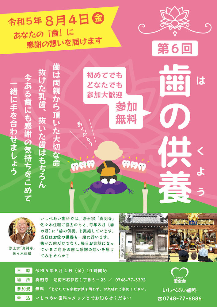 いしべあい歯科では、浄土宗「真明寺」佐々木住職ご協力のもと、毎年8月(歯の月)に「歯の供養」を実施しています。当日はお盆の供養も一緒に行います。 抜いた歯だけでなく、毎日お世話になっているご自身の歯に感謝の想いを届けてみませんか?