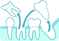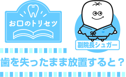 虫歯や歯周病、事故などで歯を取り除いた後、そのまま放置していると、隣り合っていた歯は倒れ、噛み合っていた歯は、歯がなくなった部分にのびて入り込んできます。その結果、歯並びが悪くなり、次のような不具合が徐々に進行します。