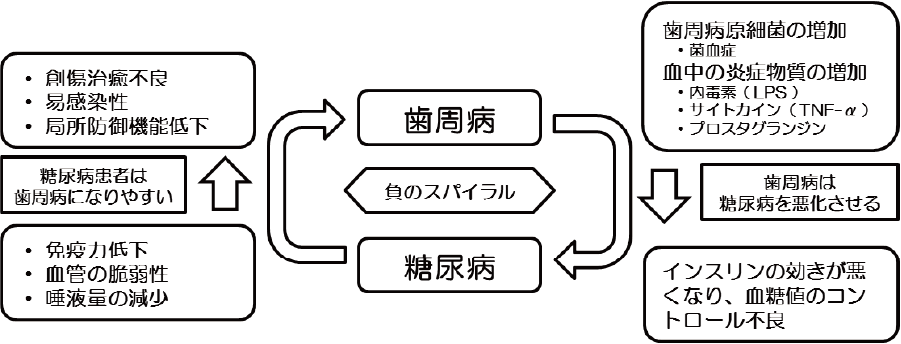 歯周病と糖尿病は相互関係にあり、どちらかを止めなければ負のサイクルを断ち切れません。